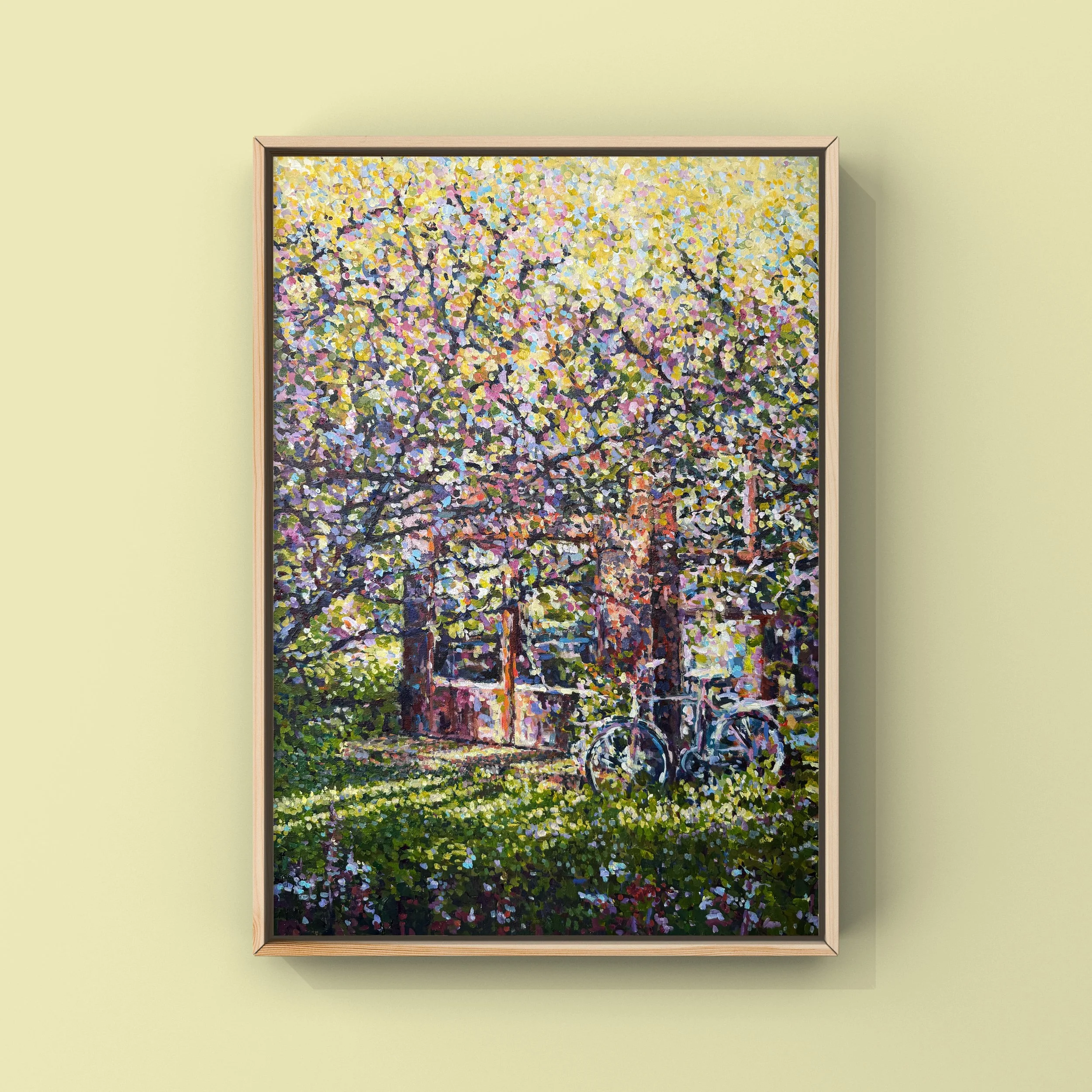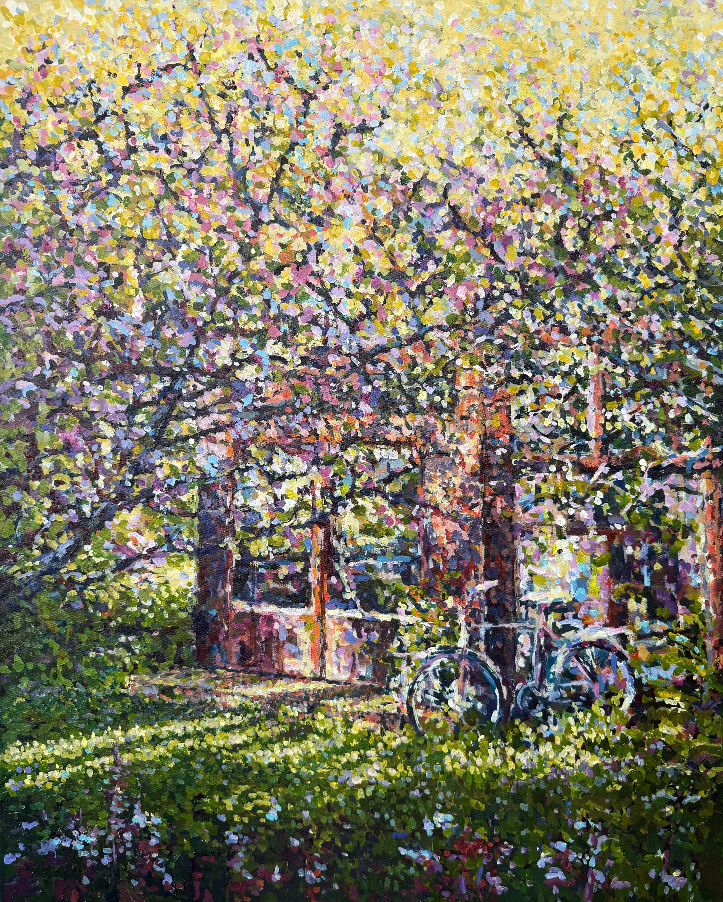 I en liten hage. Bak et gammelt Magnoliatre. Drivhus fyllt med planter. I magnolians skygge Akryl på lerret80x100